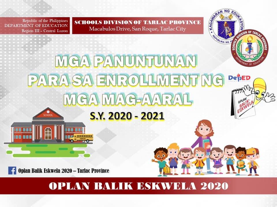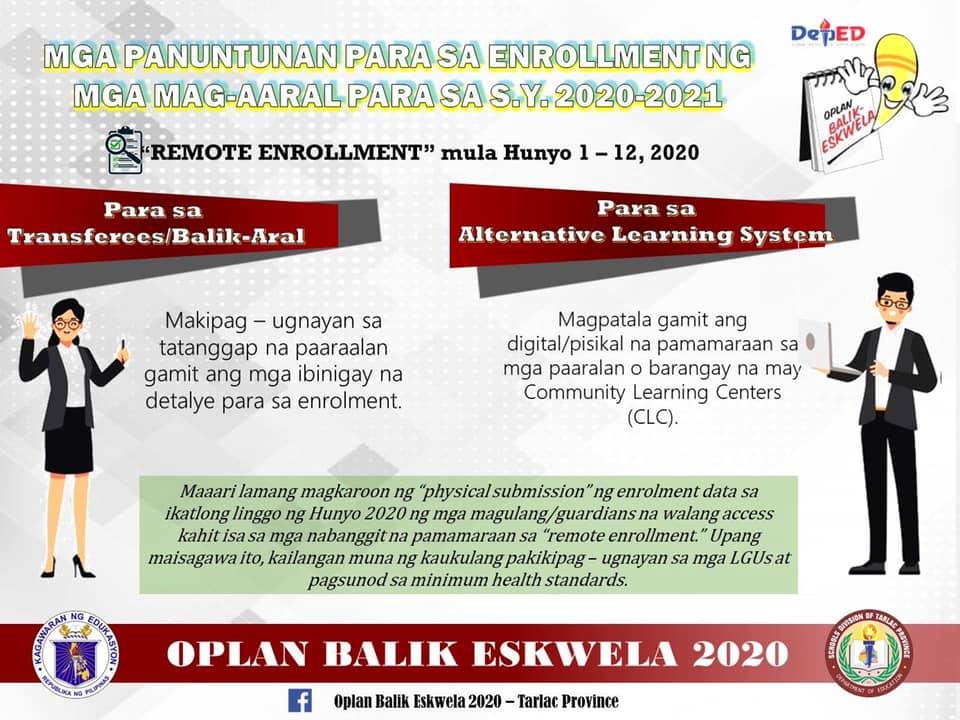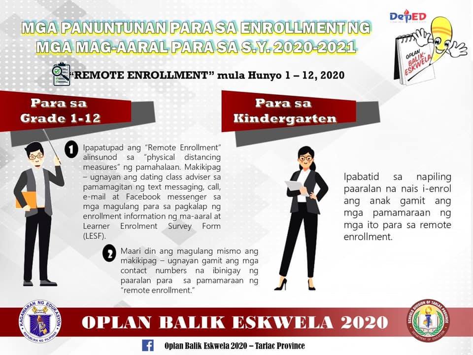 - Ipapatupad ang “Remote Enrollment” alinsunod sa “physical distancing” measures ng pamahalaan. Makipag – ugnayan ang dating class adviser sa pamamagitan ng text messaging, call, e-mail, at Facebook messenger sa mga magulang para sa pagkalap ng enrollment information ng mag-aaral at Learner Enrollment Survey Form (LESF)
